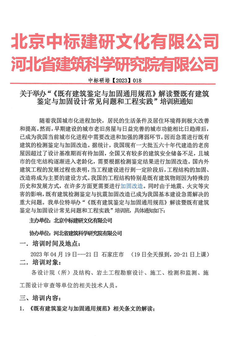 關(guān)于舉辦“《既有建筑鑒定與加固通用規(guī)范》解讀暨既有建筑鑒定與加固設(shè)計常見問題和工程實踐”培訓(xùn)班的通知