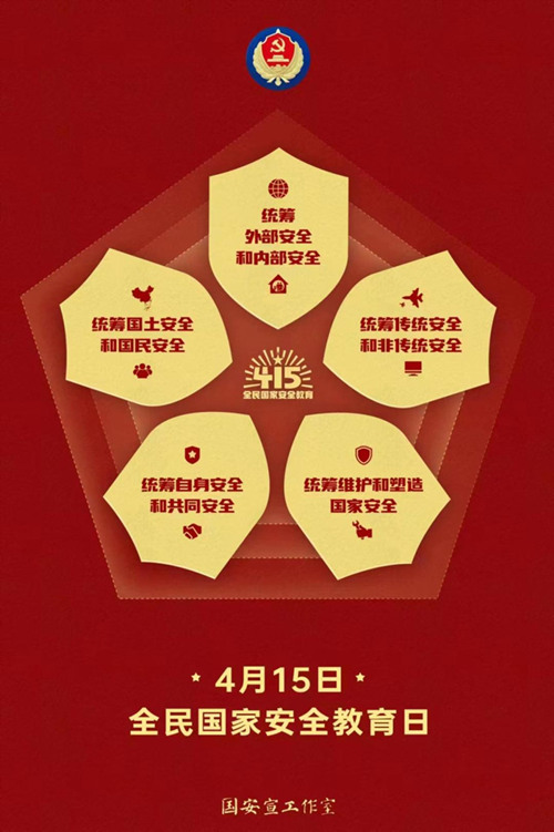 2023年4月15日是第八個(gè)全民國(guó)家安全教育日。活動(dòng)主題為:“貫徹總體國(guó)家安全觀,增強(qiáng)全民國(guó)家安全意識(shí)和素養(yǎng),夯實(shí)以新安全格局保障新發(fā)展格局的社會(huì)基礎(chǔ)。”